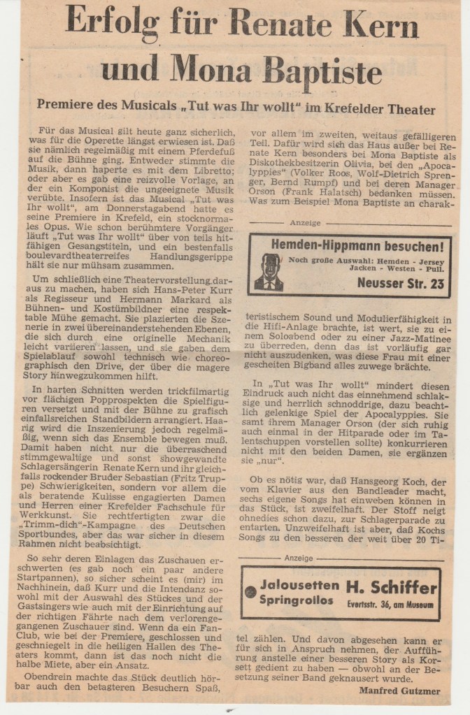 ‚Tut was ihr wollt‘ Musical Bewertungen (1970) Klicken Sie auf die Fotos, um die Bilder zu vergrößern. Teilen macht Spaß! Auf X teilen (Wird in neuem Fenster geöffnet) X Auf Facebook teilen (Wird in neuem Fenster geöffnet) Facebook Gefällt mir Wird geladen … Hinterlasse einen Kommentar Antwort abbrechen Δ