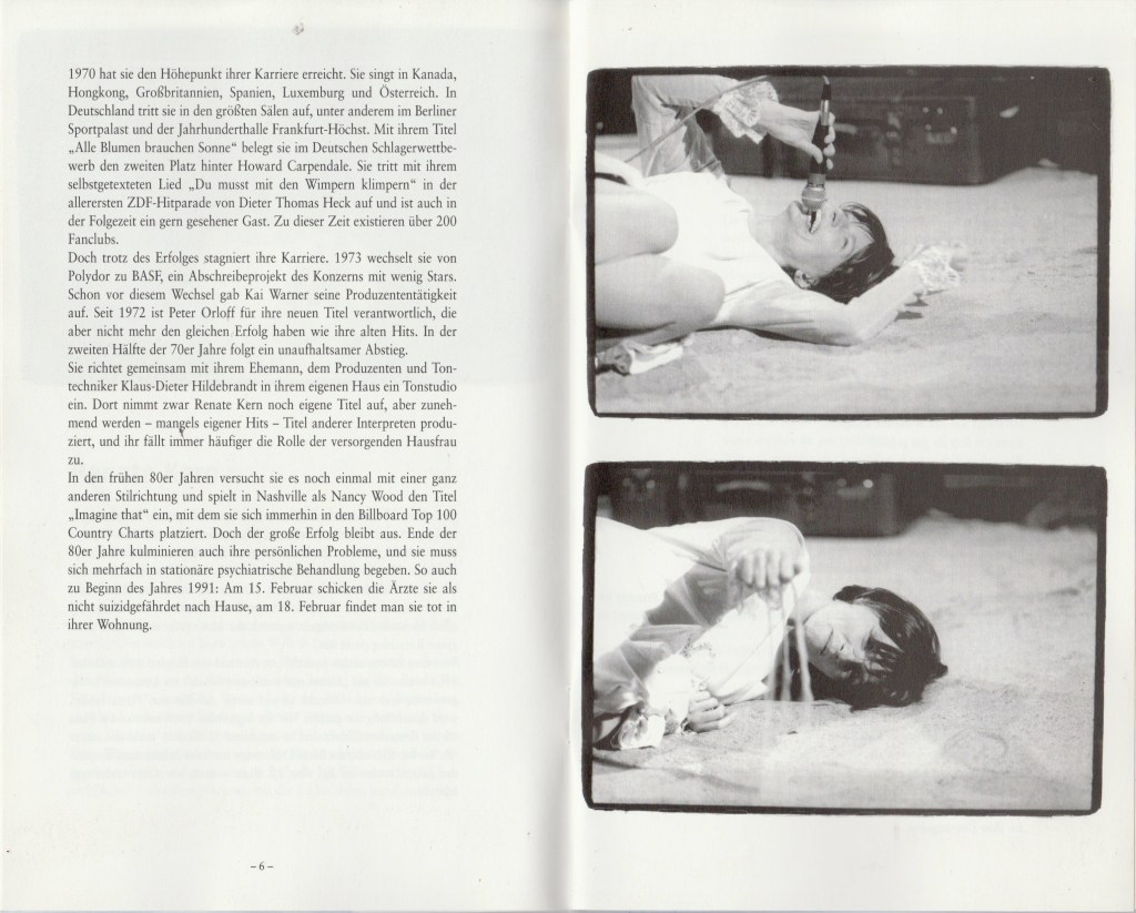 Es behandelt im Kern den Absturz einer Figur, die sich ihrer Banalität im Künstlerischen Ausdruck immer stärker bewußt wird, ins Bodenlose. Renate Kern, die sich in späteren Jahren Naca Wood nannte, ist eine Ausnahme in der deutschen Schlagerszene. Ihre ersten Schlager wurden in den 60ger Jahren bekannt, sie wurde mit dem Markenzeichen „Königin der Provinz“ abgetan. Sie wurde Dauergast in den ZDF Hitparaden, beteiligte sich an Schlagerwettbewerben und machte internationale Tourneen. Doch der internationale Erfolg blieb ihr versagt. Mitte der 70ger Jahre stagnierte die Karriere. Der Versuch, nach ihrem Aufenthalt in den USA, mit einem neuen Image als Country-Sängerin an ihre alten Erfolge anzuknüpfen, scheiterte. Es folgte ein Sturz ins Bodenlose. Renate Kern nahm sich 1991 im Alter von 46 Jahren das Leben.