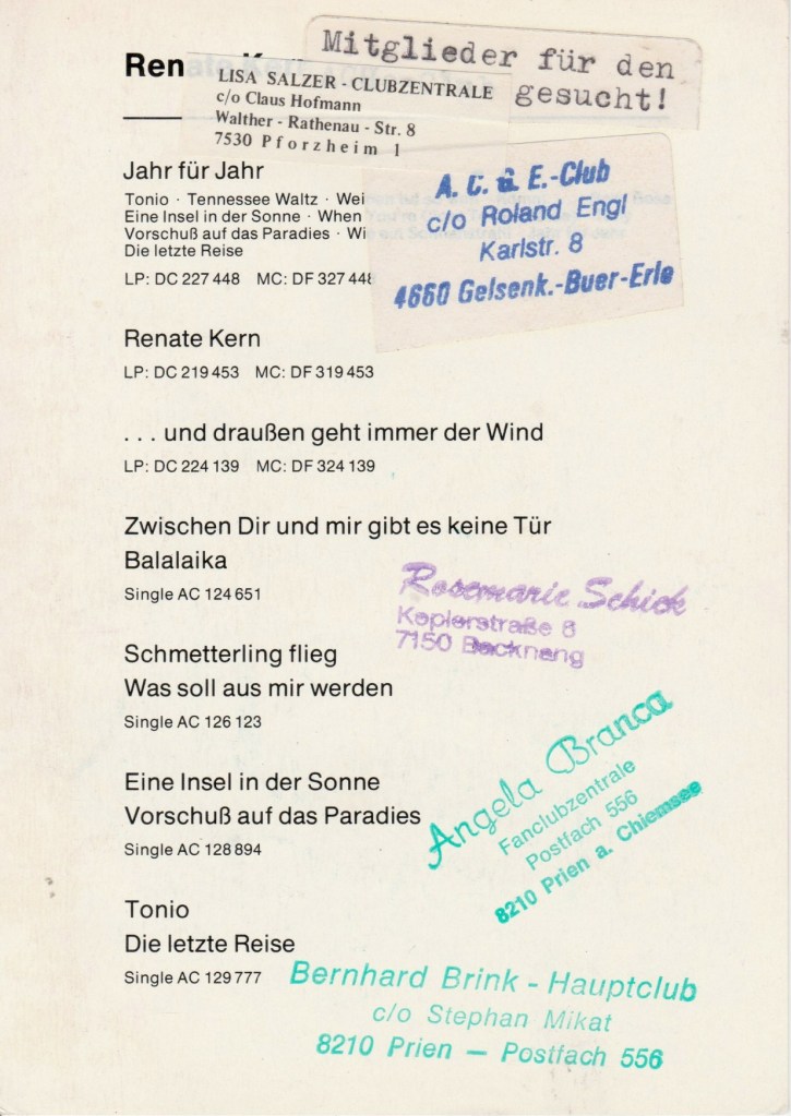 Das STUHR Konvolut ist die Sammlung des ehemaligen Vorsitzenden des Hauptfanclubs von Renate Kern in den 60er und 70er Jahren. Die Sammlung ist sehr umfangreich und enthält viele Unikate. Verteilt auf 25 Posts ist sie nun auf dieser Website zu sehen. Viel Lese- und Sehvergnügen!
